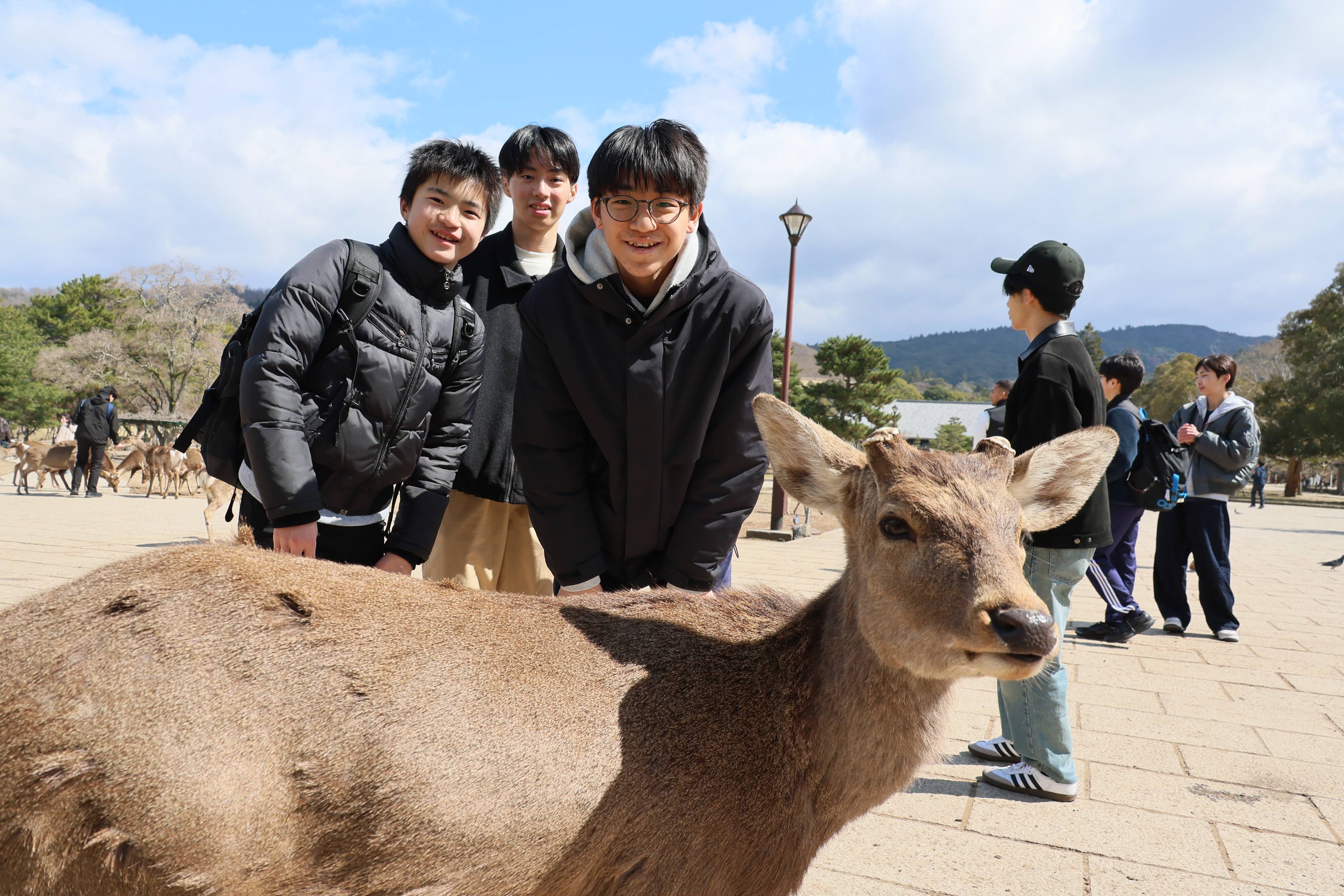 奈良公園では鹿と触れ合う時間もありました。鹿せんべいを手にした瞬間、多くの鹿に囲まれて思わず後ずさりする生徒の姿もあり、周囲から笑いが起こる場面もありました。友人同士で声をかけ合いながら鹿と向き合う姿も見られ、公園のあちこちで笑顔があふれていました。