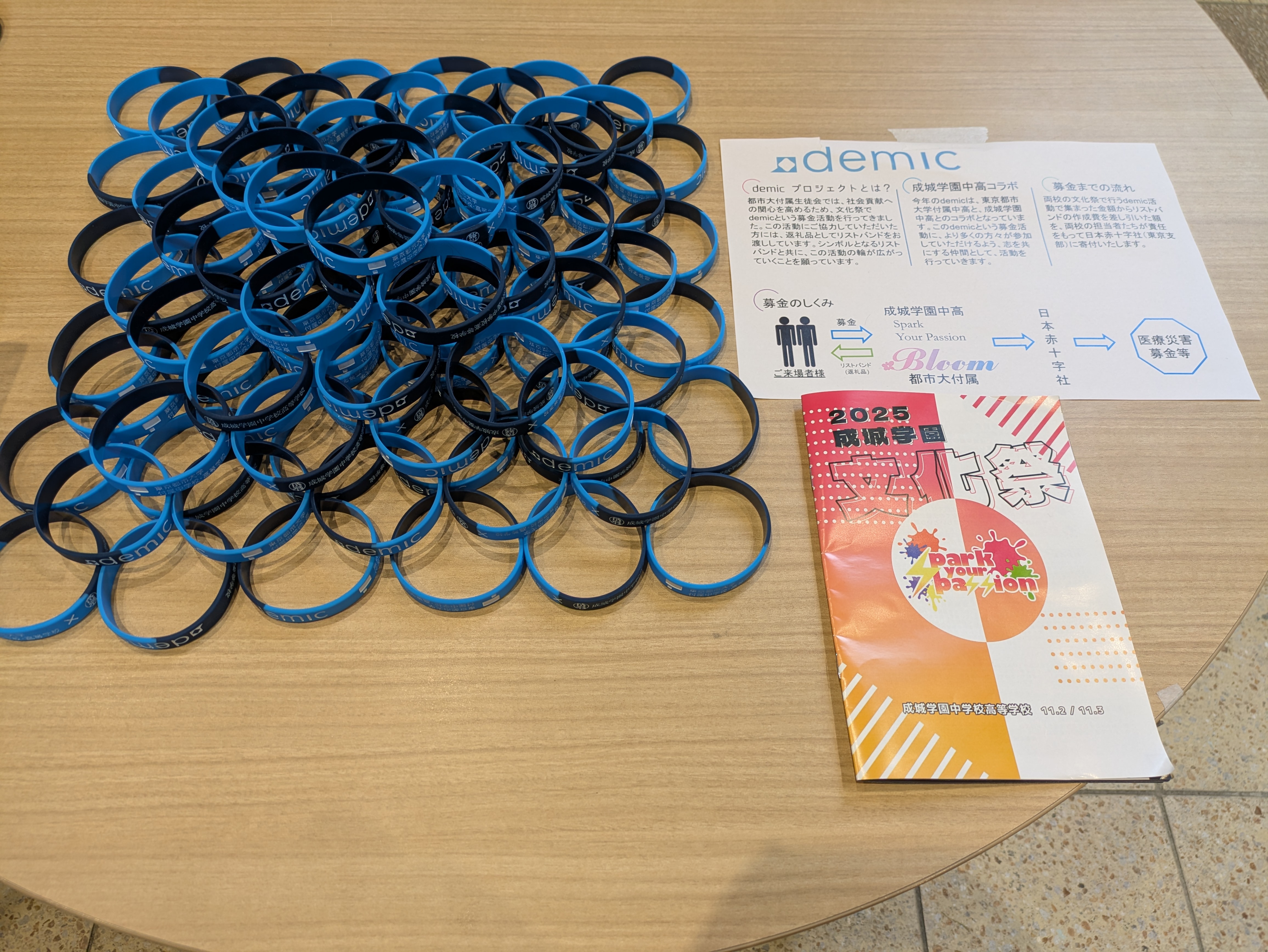 毎年本校生徒会が行っているdemic募金を共同で行い、返礼品として渡しているリストバンドを今年は成城学園とのコラボバージョンにしました。